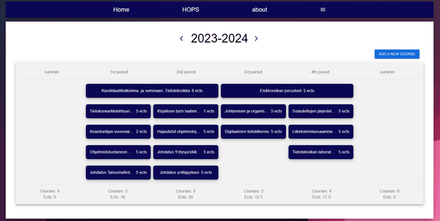 A new and revisioned Hops App made fully with NextJs, and additionally with Next-Auth, TailwindCSS and shadcn. I use this app personally to plan my studies for the academic year. It shows how many periods courses span, and calculates a load for a period based on the ECTS's of courses spanning that period.